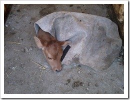 Luckily it doesn’t get too cold here in the winter. Sub-zero temperatures are unheard of, and we don’t even know what snow is. But occasionally it does reach freezing point. The babies have straw to keep them warm, but sometimes it’s not enough. So we give them a coat to help keep them warm.