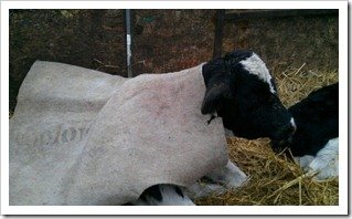 In the winter, some of the calves on the dairy get to wear coats. We have wool coats for the little calves to help keep them warm. The warm coats help keep the little babies warm, and healthy. It’s critical to keep them warm. If the baby calves get sick, their growth could be stunted.